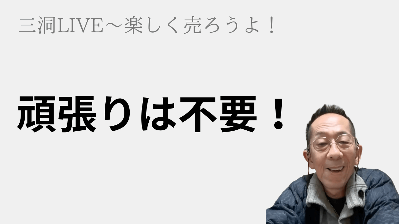 三洞LIVE〜楽しく売ろうよ!「頑張りは不要」 三洞LIVE〜楽しく売ろうよ! ポスト シェア はてブ 送る Pocket 毎週火曜日午後3時半「三洞LIVE〜楽しく売ろうよ!」 誰でも無料で視聴できます。 2026年1月20日 「頑張りは不要」 YouTubeチャンネル『【生命保険営業】三洞の「楽しく長く売り続けるために」』 にチャンネル登録をお願いします! シェア あなたの人生の大切な時間を無駄にしないために! 何度でも繰り返し受講できます。遠方の子育てママのために! 「16時間で一気に売れるようになる動画セミナー」 この記事を読んだ人へのおすすめ記事正気を取り戻せ!トークを変えるだけで!これがセールストークの「禁句」だ!「やらないこと!」あなたの「売る力」が15倍になる!見込み客の心を「つかんだ瞬間」三洞LIVE〜楽しく売ろうよ!「思考のポイント」売れない人の共通点 1日で一気に売れるようになる12時間セミナー&16時間動画 次回の開催は 1/30、2/7、2/20、2/24、2/28 新サービスを開始しました! 保険営業のお悩み相談窓口 (駆け込み寺) 苦しい状態を「我慢」するのは人生の無駄です。ほんの少しの勇気を持って「行動」してみてください! 【保険営業メルマガ】三洞の頭の中 お名前 (必須) *ご本名にて姓名を記載下さい。 メールアドレス (必須) スパム対策の為、下記の計算の答えをご入力ください。 50+20= ホームページを見てくれたあなたに半額の550円で! 三洞LIVE〜楽しく売ろうよ! 三洞LIVE〜楽しく売ろうよ! 毎週火曜日15:30〜 誰でも無料で参加できます 記事カテゴリー 生命保険営業の本質! 725 短時間で、楽しく、たくさん売る! 5 12時間セミナー、16時間動画が効く理由 70 セミナーの必須要件 2 あなたを売れなくする「間違った教え」 245 セミナー受講者の声 84 これこそが真の教材! 16 セールストーク・プレゼンテーション 54 こんな会社にいてはいけない! 82 紹介入手システム 2 三洞の「これが言いたい!」 202 三洞LIVE〜楽しく売ろうよ! 213 三洞の三洞らしき日々 77 売り上げに直結する「書く力」 1 WEBで見込み客発見! 8 動画教材 5 【読まずに売れるか!】必読図書 45 ハッピー生命保険セールスMarketing Letter 3 受講者限定記事 21 楽しく愉快な仲間たち! 48 楽しく楽に売るためのツール 6 三洞オリジナルグッズ 1