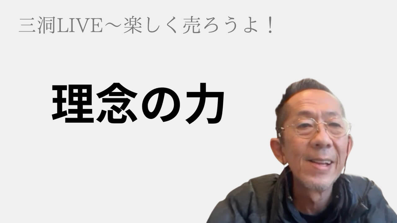 三洞LIVE〜楽しく売ろうよ!「理念の力」 三洞LIVE〜楽しく売ろうよ! ポスト シェア はてブ 送る Pocket 毎週火曜日午後3時半「三洞LIVE〜楽しく売ろうよ!」 誰でも無料で視聴できます。 2026年1月27日 「理念の力」 YouTubeチャンネル『【生命保険営業】三洞の「楽しく長く売り続けるために」』 にチャンネル登録をお願いします! シェア あなたの人生の大切な時間を無駄にしないために! 何度でも繰り返し受講できます。遠方の子育てママのために! 「16時間で一気に売れるようになる動画セミナー」 この記事を読んだ人へのおすすめ記事見込み客、探してる?売れる人と売れない人の違い(2)三洞LIVE〜楽しく売ろうよ!「時間とお金の関係」聞いたら売れないよ欠陥を放置しない!生命保険セールスの「新しい」考え方FFは「何のため」?「そろそろ気付けよ!」 1日で一気に売れるようになる12時間セミナー&16時間動画 次回の開催は 1/30、2/7、2/20、2/24、2/28 【メルマガ】三洞の頭脳 お名前 (必須) *ご本名にて姓名を記載下さい。 メールアドレス (必須) スパム対策の為、下記の計算の答えをご入力ください。 50+20= 記事カテゴリー 🔸判断基準と基本的な考え方 🔸売れる構造と思考 🔸実践のための基本とテクニック 🔸三洞独言 🔸学びの場、教材 🔸受講者限定記事 ホームページを見てくれたあなたに半額の550円で! 新サービスを開始しました! 保険営業のお悩み相談窓口 (駆け込み寺) 苦しい状態を「我慢」するのは人生の無駄です。ほんの少しの勇気を持って「行動」してみてください! 三洞LIVE〜楽しく売ろうよ! 三洞LIVE〜楽しく売ろうよ! 毎週火曜日15:30〜 誰でも無料で参加できます