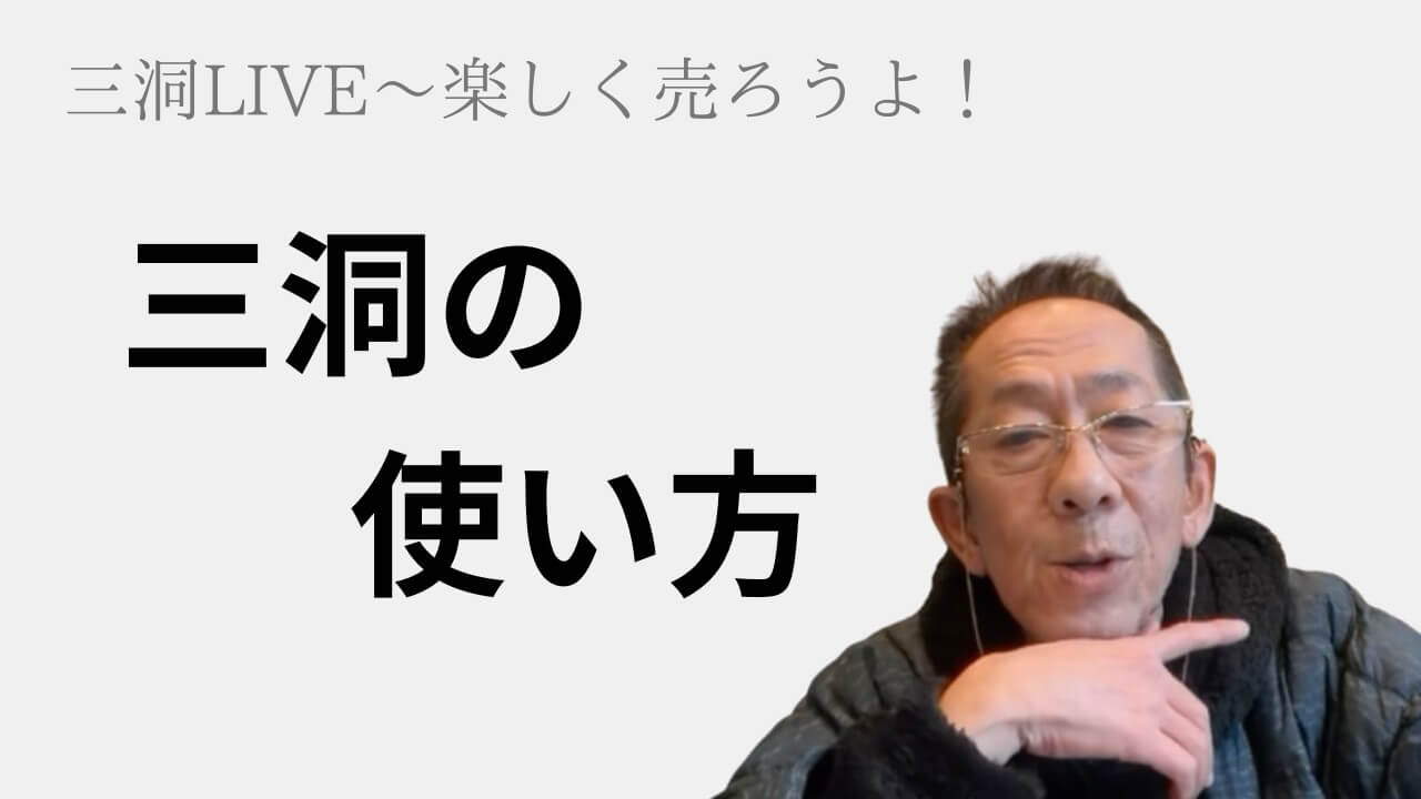 三洞LIVE〜楽しく売ろうよ!「三洞の使い方」 三洞LIVE〜楽しく売ろうよ! ポスト シェア はてブ 送る Pocket 毎週火曜日午後3時半「三洞LIVE〜楽しく売ろうよ!」 誰でも無料で視聴できます。 2026年2月17日 「三洞の使い方」 YouTubeチャンネル『【生命保険営業】三洞の「楽しく長く売り続けるために」』 にチャンネル登録をお願いします! シェア あなたの人生の大切な時間を無駄にしないために! 何度でも繰り返し受講できます。遠方の子育てママのために! 「16時間で一気に売れるようになる動画セミナー」 この記事を読んだ人へのおすすめ記事「大数」じゃなくて「60%」絶対に断られなくなる!“顧客探しはくだらない”!?簡単に思えることに集中する楽して売れよ!受講生は900人を超えました!セールストークは「順番」が大切【必読図書】「説得の心理技術」 1日で一気に売れるようになる12時間セミナー&16時間動画 次回の開催は 2/7、2/21、2/28 【メルマガ】三洞の頭脳 お名前 (必須) *ご本名にて姓名を記載下さい。 メールアドレス (必須) スパム対策の為、下記の計算の答えをご入力ください。 50+20= 記事カテゴリー 🔸判断基準と基本的な考え方 🔸売れる構造と思考 🔸実践のための基本とテクニック 🔸三洞独言 🔸学びの場、教材 🔸受講者限定記事 ホームページを見てくれたあなたに半額の550円で! 新サービスを開始しました! 保険営業のお悩み相談窓口 (駆け込み寺) 苦しい状態を「我慢」するのは人生の無駄です。ほんの少しの勇気を持って「行動」してみてください! 三洞LIVE〜楽しく売ろうよ! 三洞LIVE〜楽しく売ろうよ! 毎週火曜日15:30〜 誰でも無料で参加できます